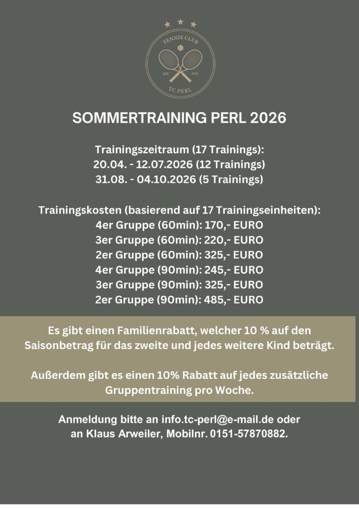 Der Tennisclub Perl lädt ein zur jährlichen Mitgliederversammlung am Sonntag, den 17.12.23 um 18 Uhr im Clubhaus auf der Tennisanlage in Perl. Tagesordnung 1. Begrüßung 2. Jahresbericht des Vorstandes 3. Bericht der Kassenprüfer 4. Entlastung des Vorstandes 5. Anpassung der Mitgliedsbeiträge 6. Verschiedenes Anträge zur Mitgliederversammlung können bis zum 15.12 beim Vorstand schriftlich eingereicht…